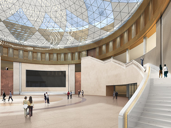 淮州新城國(guó)際會(huì)展中心采用圓形作為基本形體,通過(guò)透明玻璃幕墻從底部托起,營(yíng)造出建筑整體懸浮半空的姿態(tài),形似“UFO”飛行器。主要分為展覽中心、會(huì)議中心、航空博物館和設(shè)備用房及庫(kù)房等輔助功能區(qū)三部分功能分區(qū)。一層為展廳,服務(wù)于未來(lái)航空產(chǎn)業(yè)產(chǎn)品的展覽,二三層為會(huì)議功能區(qū),服務(wù)于大型航空產(chǎn)業(yè)會(huì)議的召開(kāi),四層為航天博物館。未來(lái),淮州新城國(guó)際會(huì)展中心將成為淮州新城通用航空產(chǎn)業(yè)對(duì)外展示的窗口。