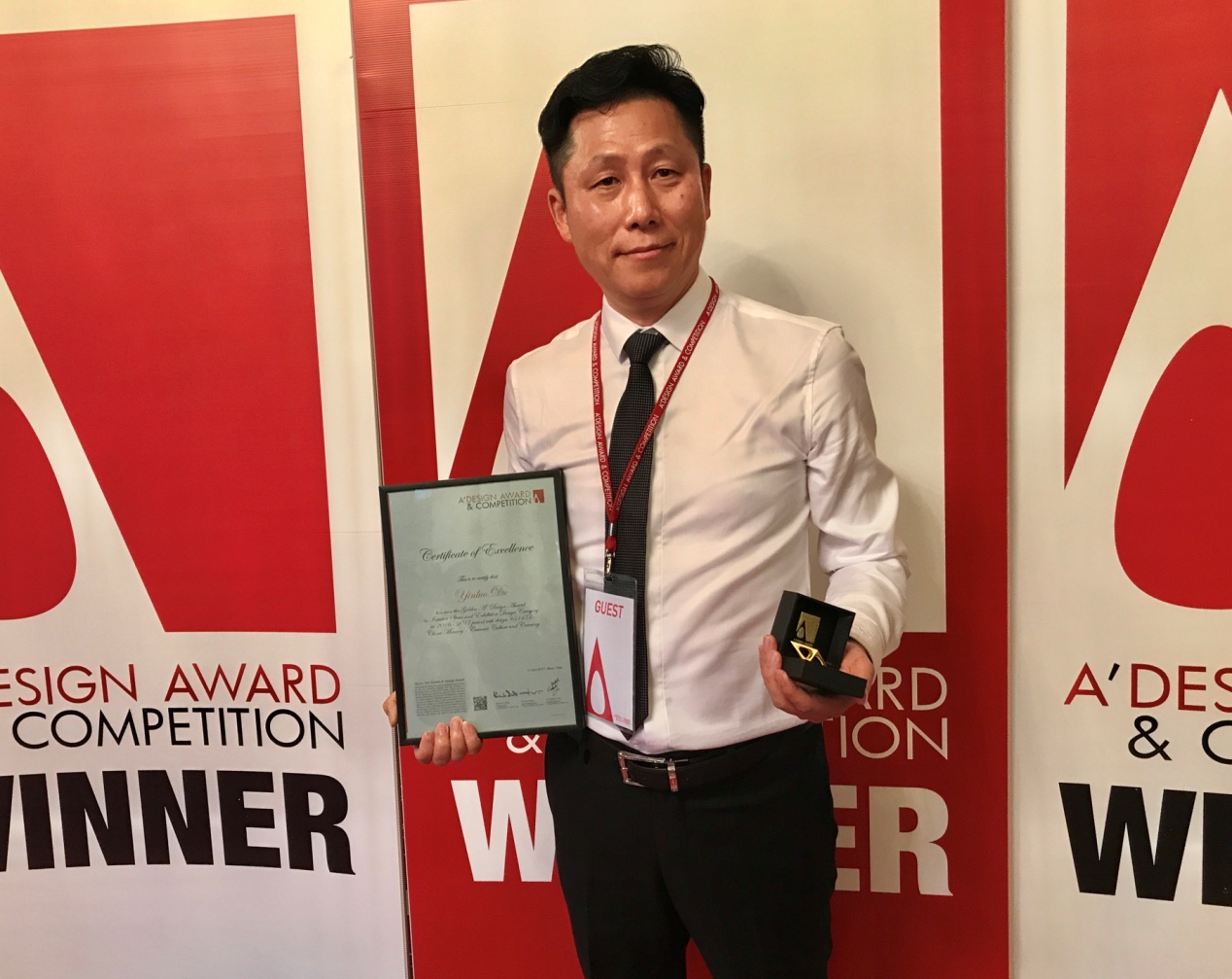 上海瓷憶文化餐廳設計獲得金獎,中航裝飾設計院院長易強作為設計團隊主創(chuàng)設計師與楊超設計師、瓷憶品牌創(chuàng)始人杜銀羅先生一道應邀參加了頒獎典禮。