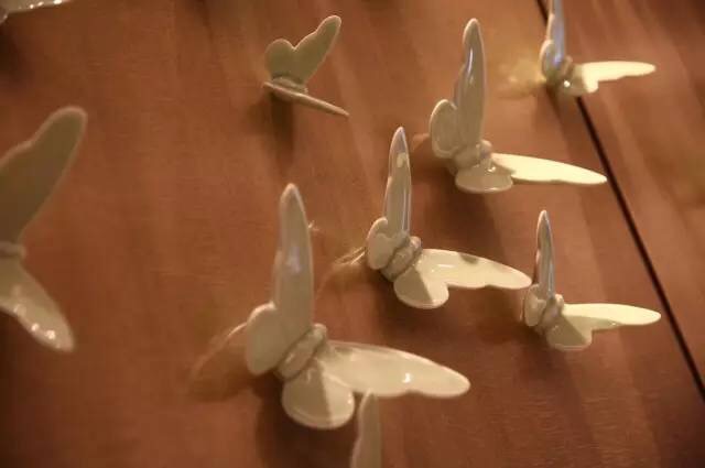 宴客大廳前側弧形墻上,由平面設計大師楊超教授先生設計了199只翩翩飛舞的粉彩蝴蝶,寓意著貴賓們一生一世情愛久久。