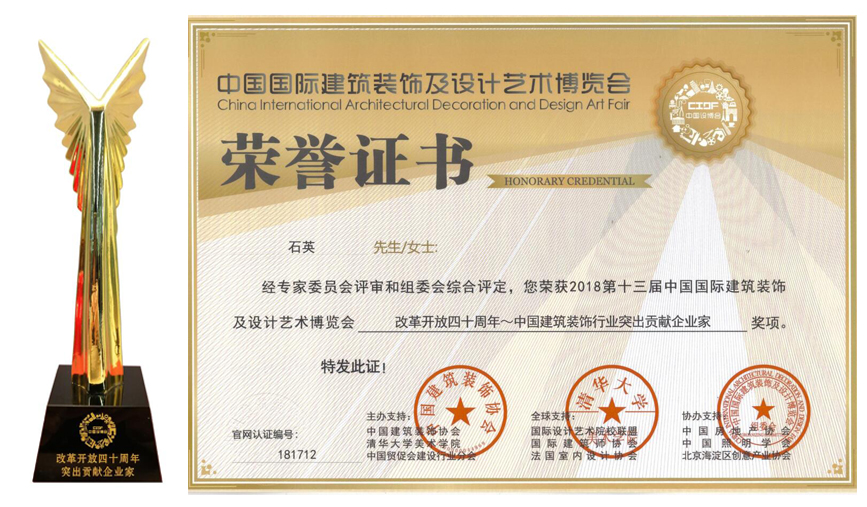 ? ? ??近日,由中國建筑裝飾協(xié)會與清華大學(xué)美術(shù)學(xué)院聯(lián)合主辦的第十三屆中國國際建筑裝飾及設(shè)計藝術(shù)博覽會在北京國際會議中心舉行,在本次博覽會上,中航裝飾被授予“改革開放四十周年~中國建筑裝飾行業(yè)突出貢獻企業(yè)”稱號,中航裝飾集團石英董事長被評為“改革開放四十周年~中國建筑裝飾行業(yè)突出貢獻企業(yè)家”。