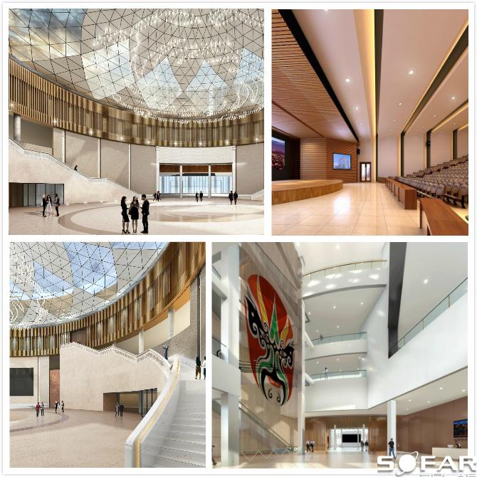 淮州新城國際會展中心采用圓形作為基本形體,通過透明玻璃幕墻從底部托起,營造出建筑整體懸浮半空的姿態,形似“UFO”飛行器。主要分為展覽中心、會議中心、航空博物館和設備用房及庫房等輔助功能區三部分功能分區。一層為展廳,服務于未來航空產業產品的展覽,二三層為會議功能區,服務于大型航空產業會議的召開,四層為航天博物館。未來,淮州新城國際會展中心將成為淮州新城通用航空產業對外展示的窗口。