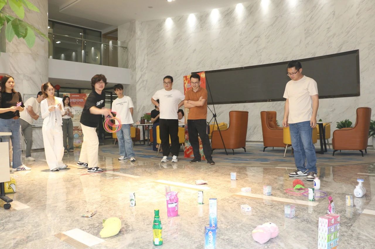 在“玉兔套圈”的游戲環節,參與者手持圈環,目標便是前方擺放的物品。游戲看似簡單,卻需要精準的技巧和良好的手眼協調能力。員工們爭相挑戰,歡聲笑語充滿了整個場地。