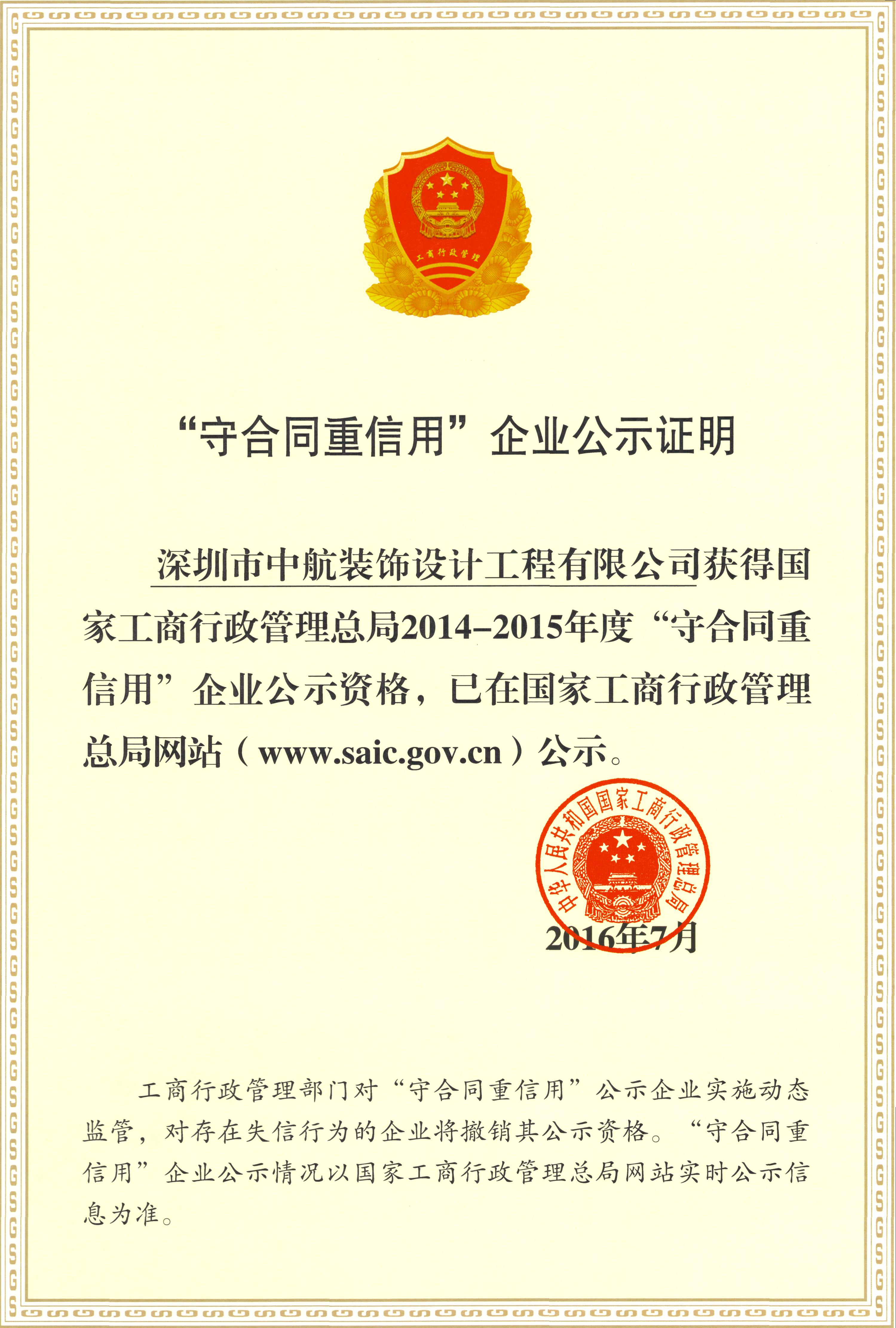 近日,國(guó)家工商行政管理總局“全國(guó)守合同重信用企業(yè)”評(píng)選結(jié)果揭曉,中航裝飾集團(tuán)獲此殊榮,成為2014-2015年度國(guó)家級(jí)“守合同重信用”企業(yè)。